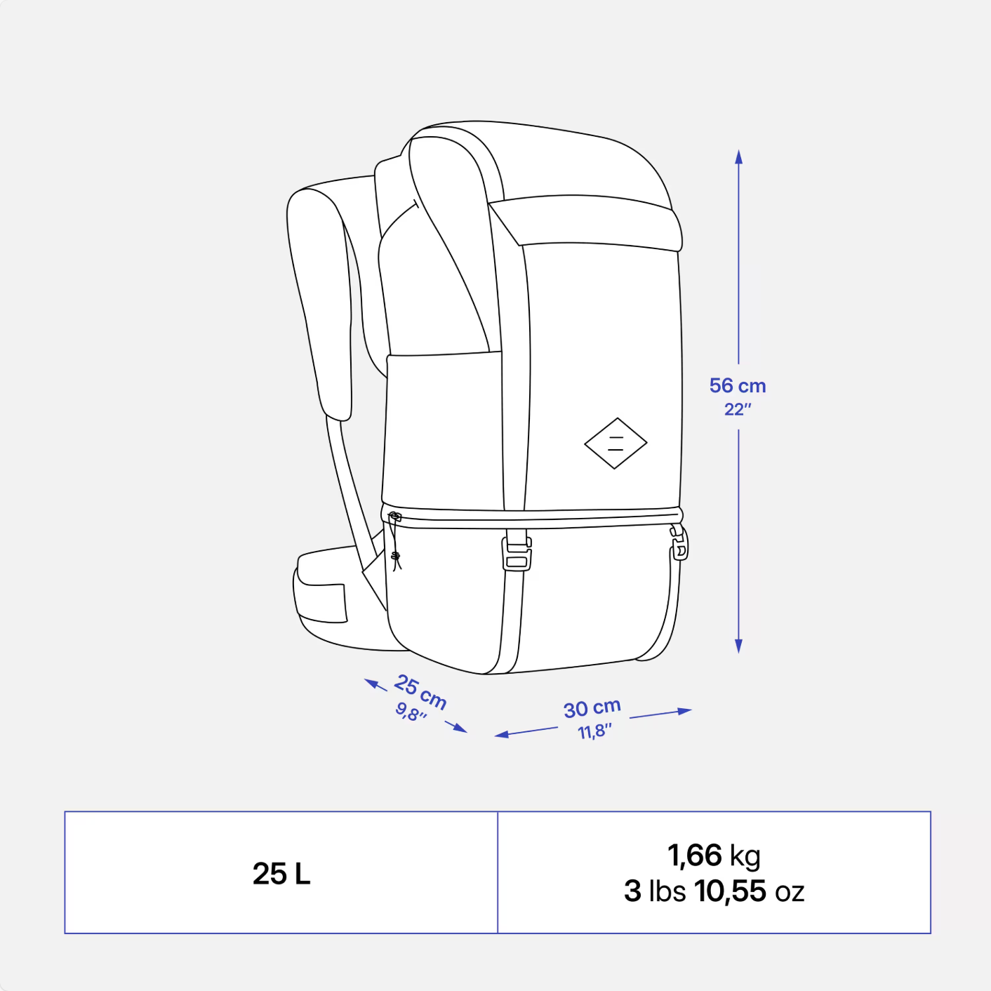 The backpack measures 56x25x30 cm and offers a generous 25L capacity, making it perfect for day trips, hiking, or any outdoor activity. Weighing just 1.66 kg, it’s lightweight yet durable, constructed from high-quality polyester material to withstand the elements.