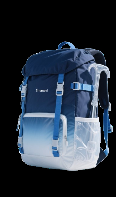 The backpack has a visually appealing design with a gradient color from deep blue at the top to light blue and white at the bottom. The brand name “Shunwei” is prominently displayed. Its streamlined shape, with smooth curves and well – integrated straps and compartments, looks modern. The blue straps and buckles contrast nicely with the main body, and the transparent side pocket adds a unique, modern touch.