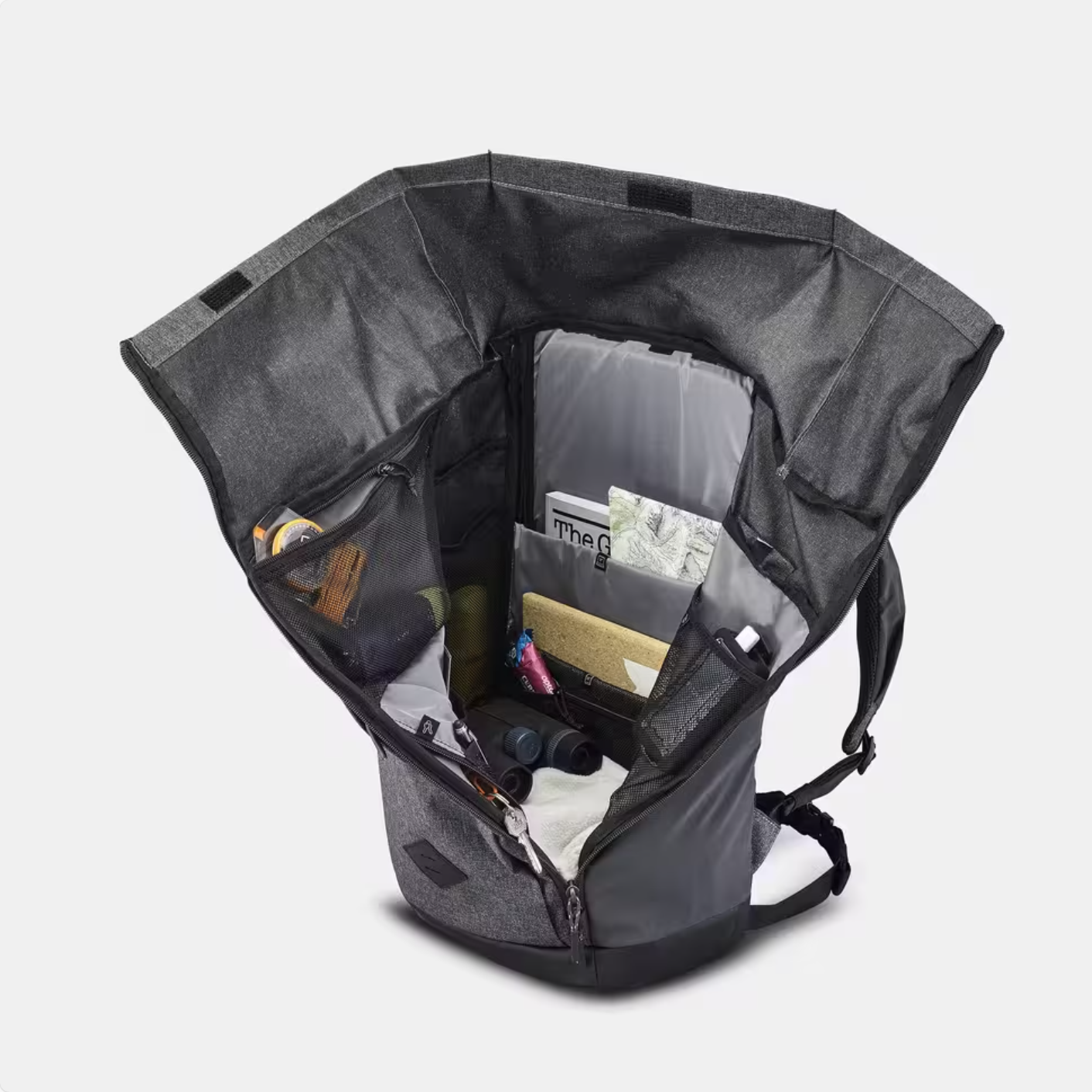 Front zippered pocket for quick access to keys, wallets, gym cards; side mesh pockets for water bottles.